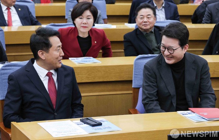 [서울=뉴스핌] 윤창빈 기자 = 토론회를 공동 주최한 오세훈 서울시장과 신동욱 국민의힘 의원이 5일 서울 여의도 국회 의원회관에서 열린 시내버스 필수공익사업 지정 토론회에서 대화를 나누고 있다. 2026.02.05 pangbin@newspim.com