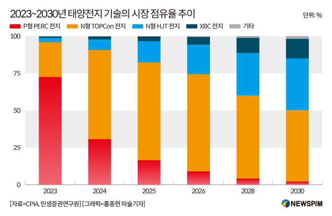 장기적으로는 실리콘 기반 HJT와 페로브스카이트를 결합한 탠덤 태양전지로의 전환이 예상된다.