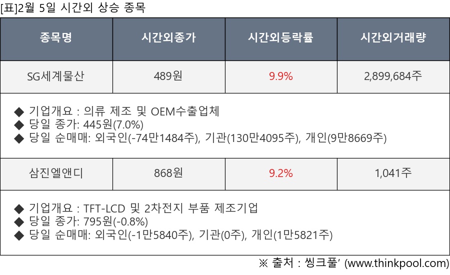 [서울=뉴스핌] 로보뉴스 = 2월 5일, 인공지능 투자비서 ‘AI라씨로’가 SG세계물산(004060), 삼진엘앤디(054090) 등 시간외 단일가 매매 상승률 상위 종목들에 대한 최근 동향을 분석했다.