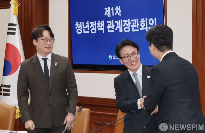 [서울=뉴스핌] 이길동 기자 = 김민석 국무총리가 6일 서울 종로구 정부서울청사에서 열린 제1차 청년정책 관계장관회의에서 우재준 국민의힘 청년위원장(오른쪽)과 인사를 하고 있다.왼쪽은 모경종 더불어민주당 청년위원장. 2026.02.06 gdlee@newspim.com
