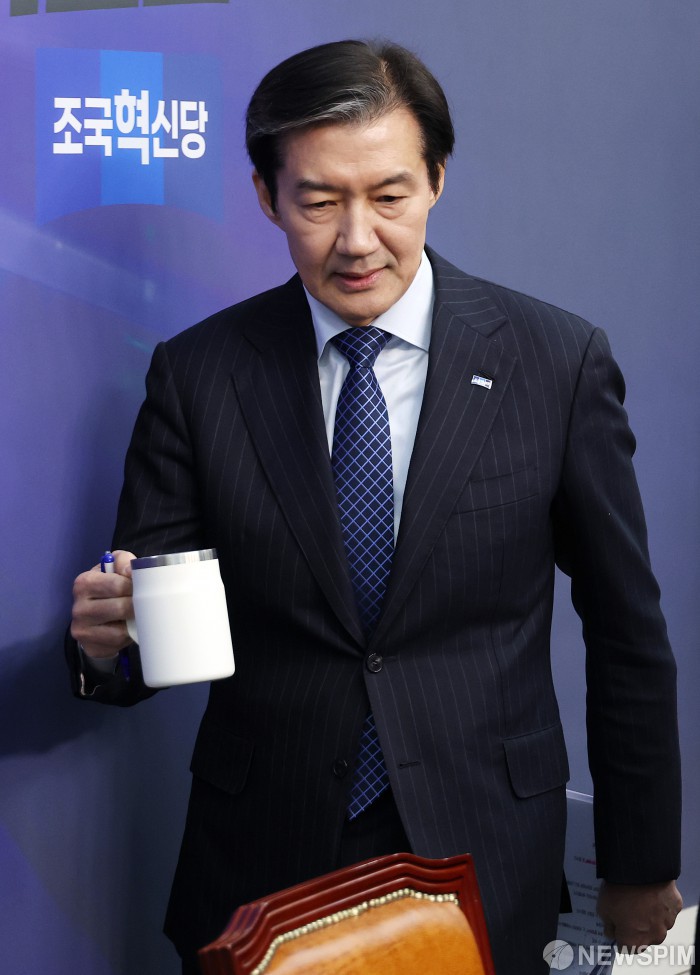 [서울=뉴스핌] 정일구 기자 = 조국 조국혁신당 대표가 8일 오전 서울 여의도 국회에서 열린 기자간담회에서 더불어민주당과 합당 문제에 관한 입장을 발표한 뒤 취재진 질의응답을 위해 자리로 이동하고 있다. 2026.02.08 mironj19@newspim.com