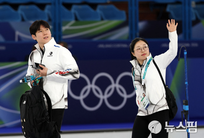 [밀라노 로이터=뉴스핌] 장환수 스포츠전문기자= 컬링 믹스더블 김선영-정영석 조가 8일 에스토니아와 라운드 로빈 7차전에서 승리한 뒤 경기장을 떠나기 전 관중들을 향해 인사하고 있다. 2026.02.08 zangpabo@newspim.com