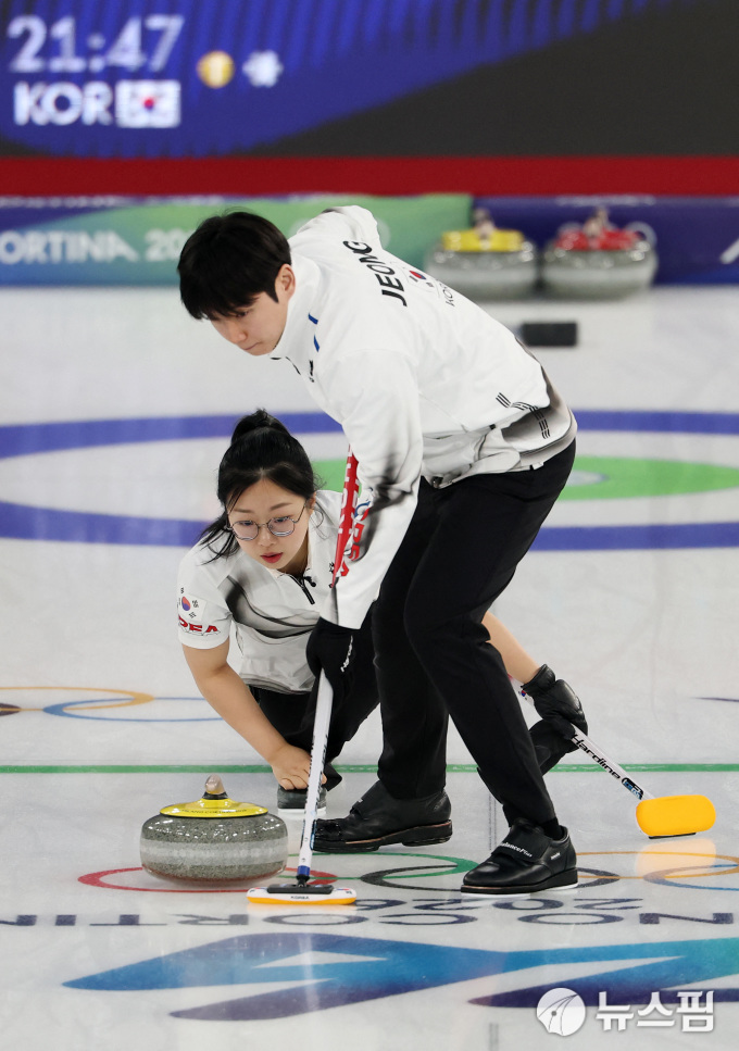김선영-정영석 조는 8일(한국시간) 이탈리아 코르티나담페초 코르티나 컬링 올림픽 스타디움에서 열린 2026 밀라노·코르티나담페초 동계올림픽 믹스더블 라운드로빈 7차전에서 에스토니아의 마리에 칼드베-하리 릴 조를 9-3으로 꺾었다.