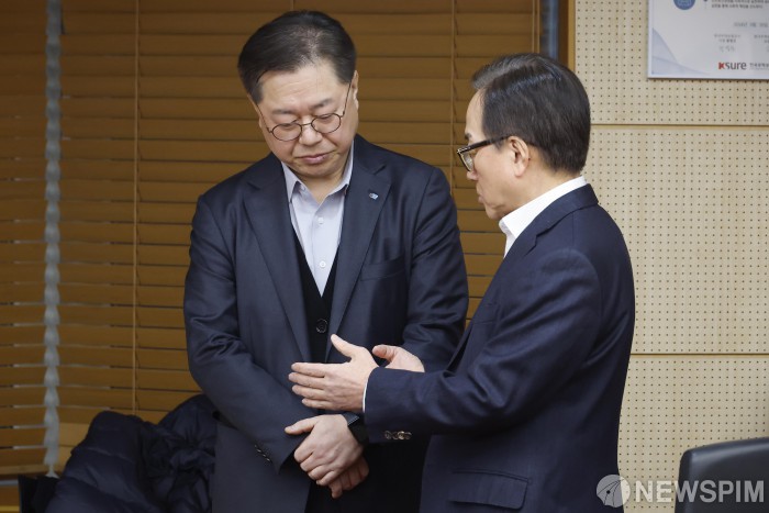 [서울=뉴스핌] 류기찬 기자 = 박일준 대한상공회의소 부회장이 9일 오전 서울 종로구 한국무역보험공사에서 열린 경제단체 긴급현안 점검회의에서 관계자들과 대화를 나누고 있다. 2026.02.09 ryuchan0925@newspim.com