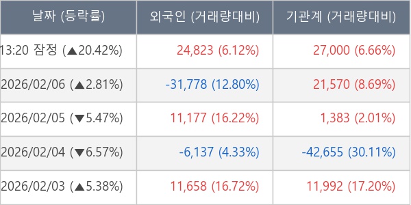 [서울=뉴스핌] 로보뉴스 = 09일 13시 30분 현재 한국피아이엠(448900)은 외국인과 기관이 각각 2.48 만 주, 2.70 만 주 순매수(잠정) 하면서 전일 대비 20.42% (현재가 74,900원) 상승하고 있다.