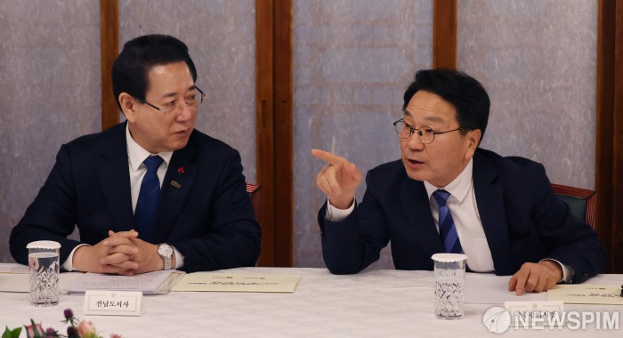 [서울=뉴스핌] 이형석 기자 = 김영록 전남도지사(왼쪽)와 강기정 광주시장이 9일 오후 서울 종로구 총리공관에서 전남광주행정통합 관련 면담을 앞두고 대화를 나누고 있다. 2026.02.09 leehs@newspim.com