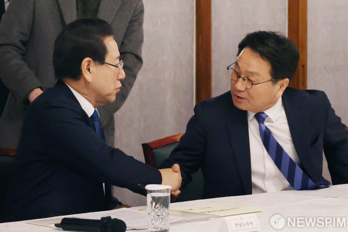 [서울=뉴스핌] 이형석 기자 = 김영록 전남도지사(왼쪽)와 강기정 광주시장이 9일 오후 서울 종로구 총리공관에서 전남광주행정통합 관련 면담을 앞두고 인사를 나누고 있다. 2026.02.09 leehs@newspim.com