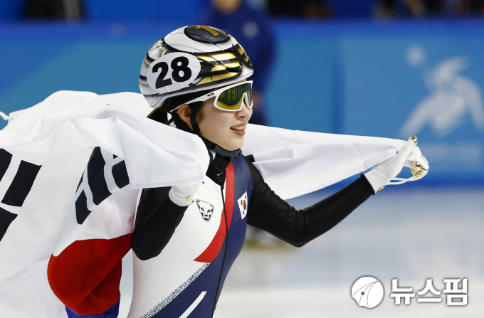 [하얼빈 로이터=뉴스핌] 장환수 스포츠전문기자= 김길리가 2025년 2월 8일 중국 하얼빈 헤이룽장 빙상훈련센터 다목적홀에서 열린 여자 1500m 결선에서 금메달을 따낸 뒤 태극기 세리머니를 펼치고 있다. 2025.02.08 zangpabo@newspim.com