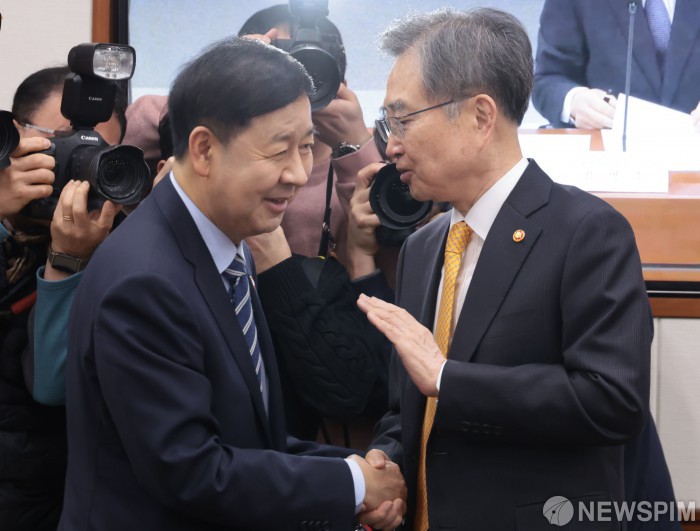 [서울=뉴스핌] 이길동 기자 = 구윤철 부총리 겸 재정경제부 장관와 조현 외교부 장관이 10일 서울 종로구 정부서울청사에서 열린 대외경제관계장관회의에서 인사하며 대화를 하고 있다.2026.02.10 gdlee@newspim.com