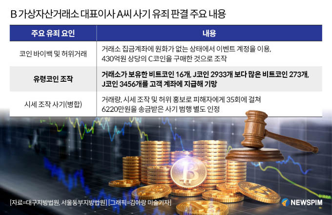 9일 뉴스핌이 확보한 판결문에 따르면 대구지방법원 서부지원은 지난해 7월 A 가상자산거래소 대표 B씨의 사기 사건에서 징역 6개월을 선고했다. 판결문은 거래소가 실제 보유 물량보다 많은 코인을 보유한 것처럼 운영해 고객을 오인하게 한 행위를 사기로 인정했다.