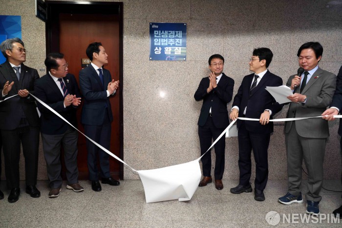 [서울=뉴스핌] 윤창빈 기자 = 한병도 더불어민주당 원내대표와 김한규 원내정책수석부대표를 비롯한 참석자들이 10일 오전 서울 여의도 국회에서 민생경제 입법추진 상황실 현판식을 하고 있다. 2026.02.10 pangbin@newspim.com