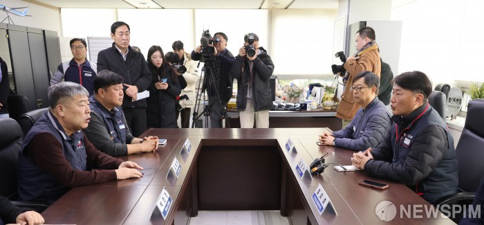 [서울=뉴스핌] 이형석 기자 = 양경수 민주노총 위원장이 10일 오전 서울 여의도 한국노총에서 김동명 위원장과 대화를 나누고 있다. 2026.02.10 leehs@newspim.com