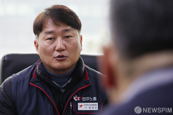 [서울=뉴스핌] 이형석 기자 = 양경수 민주노총 위원장이 10일 오전 서울 여의도 한국노총에서 김동명 위원장과 대화를 나누고 있다. 2026.02.10 leehs@newspim.com