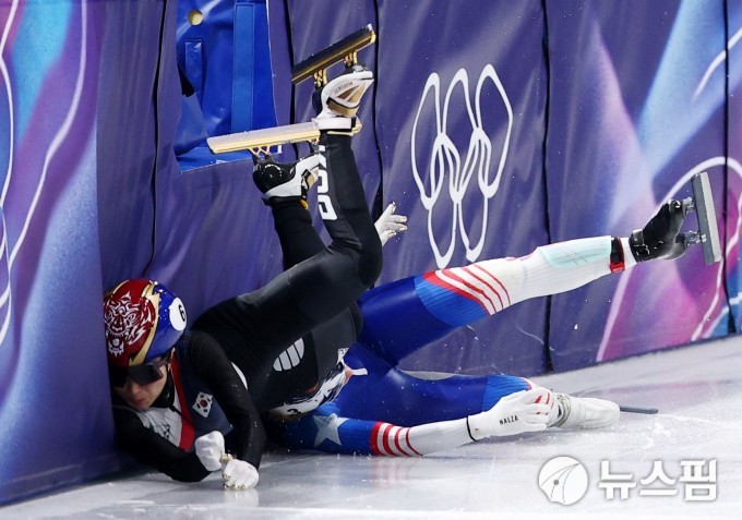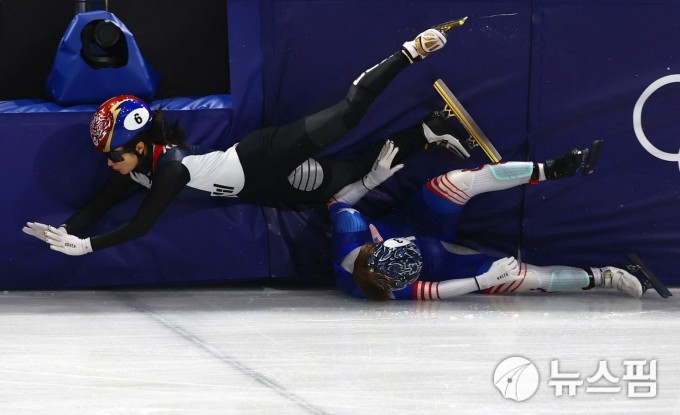 [밀라노 로이터=뉴스핌] 박상욱 기자= 김길리가 10일(한국시간) 이탈리아 밀라노의 밀라노 아이스 스케이팅 아레나에서 열린 2026 밀라노-코르티나 동계올림픽 쇼트트랙 혼성계주 2000m 준결승에서 미국 선수에 걸려 넘어지고 있다. 2026.2.10 psoq1337@newspim.com