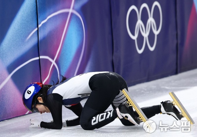[밀라노 로이터=뉴스핌] 박상욱 기자= 김길리가 10일(한국시간) 이탈리아 밀라노의 밀라노 아이스 스케이팅 아레나에서 열린 2026 밀라노-코르티나 동계올림픽 쇼트트랙 혼성계주 2000m 준결승에서 미국 선수에 걸려 넘어진 뒤 아쉬워하고 있다. 2026.2.10 psoq1337@newspim.com