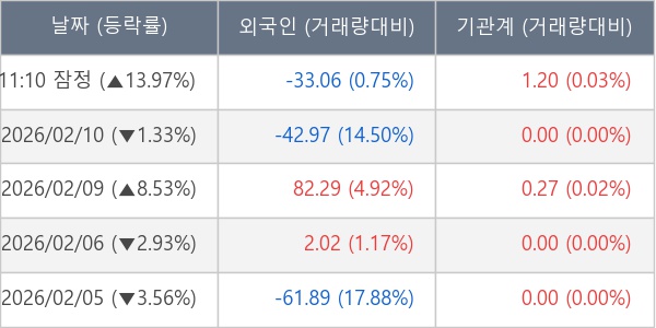 [서울=뉴스핌] 로보뉴스 = 11일 11시 30분 현재 보성파워텍(006910)은 전일 대비 13.97% (현재가 9,300원) 상승했고, 기관이 최근 5일 연속 순매수(누적 14,738주, 잠정) 행진을 하고 있다.