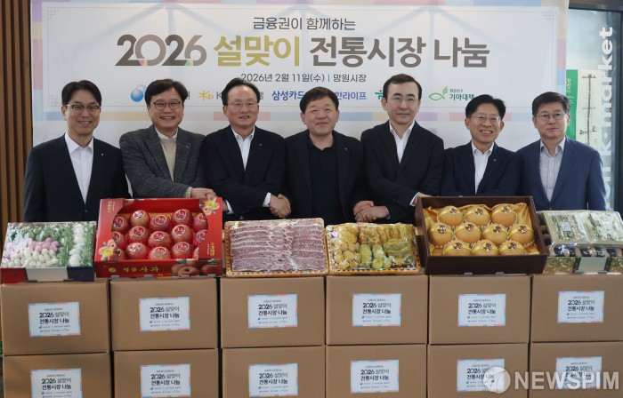 [서울=뉴스핌] 정일구 기자 = 이세훈 금융감독원 수석부원장이 11일 오전 서울 마포구 망원시장에서 열린 2026 금융권이 함께하는 설 맞이 전통시장 나눔행사에서 참석자들과 기념촬영을 하고 있다. 왼쪽부터 천상영 신한라이프 대표, 최창남 희망친구 기아대책 회장, 이환주 KB국민은행장, 김은종 망원시장 상인회장, 강성묵 하나증권 대표, 김이태 삼성카드 대표. 2026.02.11 mironj19@newspim.com