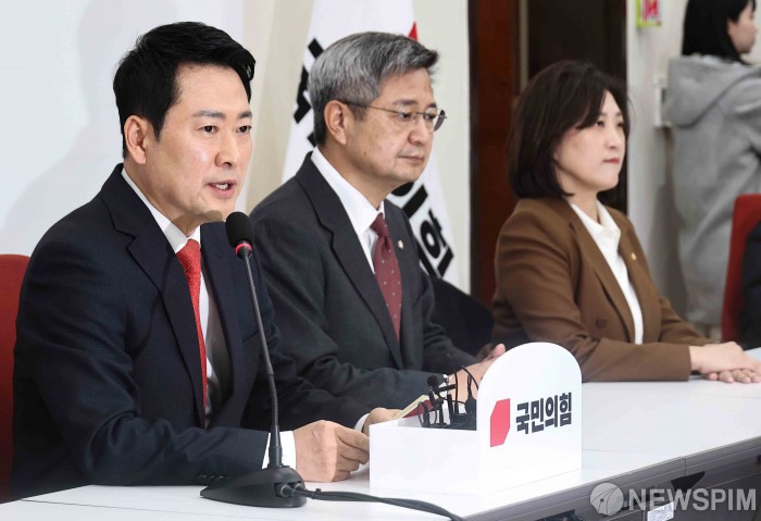 [서울=뉴스핌] 윤창빈 기자 = 장동혁 국민의힘 대표가 12일 오전 서울 여의도 국회에서 이재명 대통령과의 오찬 불참 관련 기자회견을 하고 있다. 2026.02.12 pangbin@newspim.com