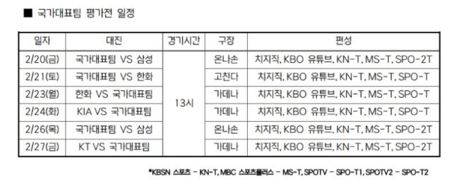 [서울=뉴스핌] 남정훈 기자 = 오는 3월 열리는 월드베이스볼클래식(WBC)을 앞두고 일본 오키나와에서 전지훈련을 진행하는 대한민국 야구대표팀의 평가전 일정과 중계 계획이 확정됐다.