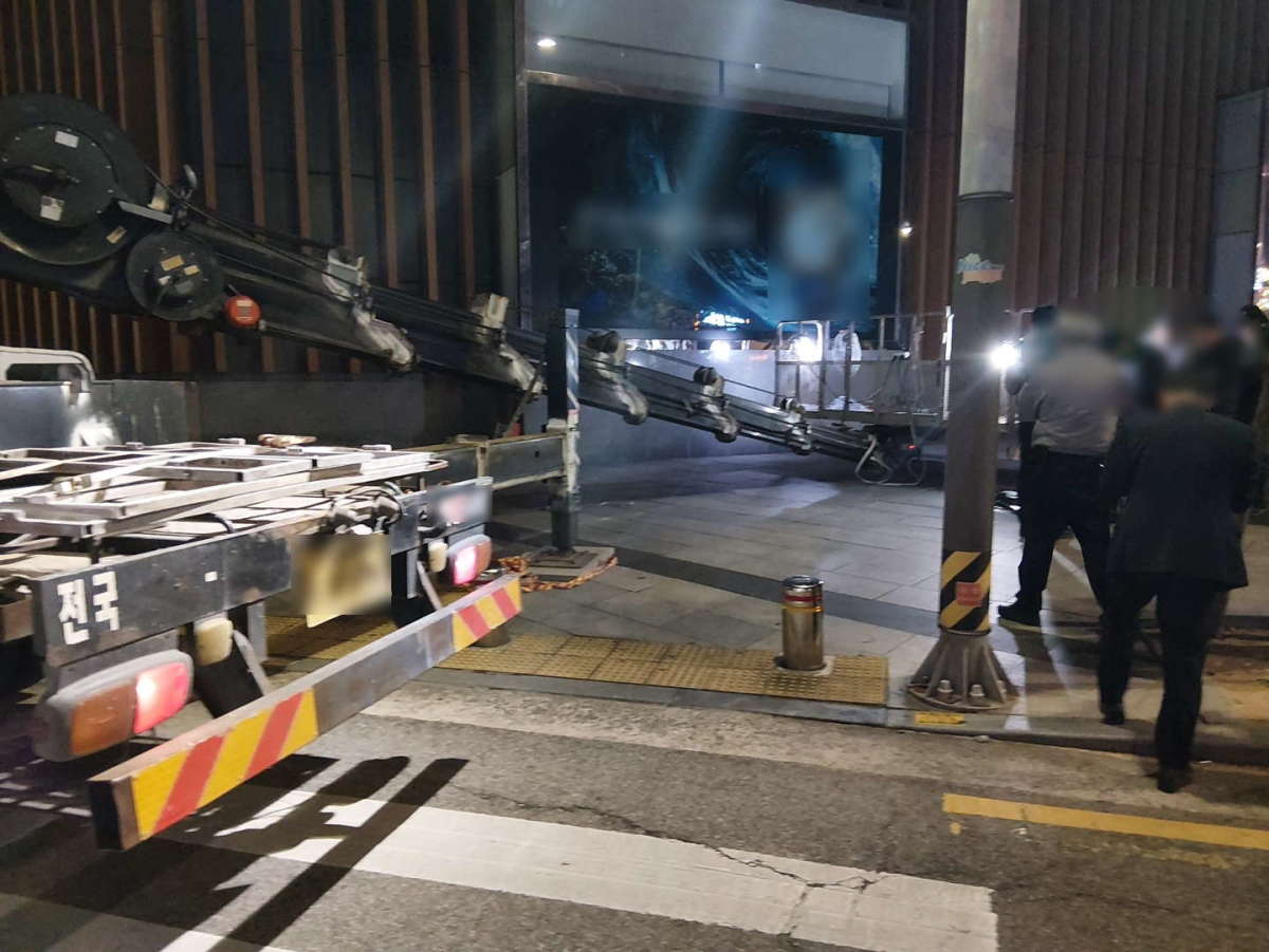 [부산=뉴스핌] 남동현 기자 = 12일 오후 8시40분께 부산 중구 한 백화점 10층 외벽 고소작업대에서 현수막 교체 작업 중 A(50대)씨가 10m 아래 돌출 구조물로 떨어졌다.
