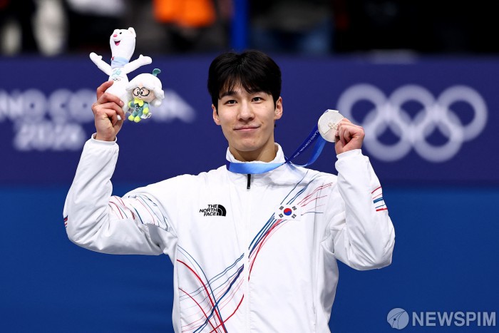 [밀라노=로이터뉴스핌] 밀라노 코르티나 2026 올림픽에 출전한 쇼트트랙 선수 황대헌이 지난 14일 이탈리아 밀라노 아이스 스케이팅 아레나에서 열린 남자 1500m 시상식에서 은메달을 획득하고 포즈를 취하고 있다. 2026.02.11 photo@newspim.com
