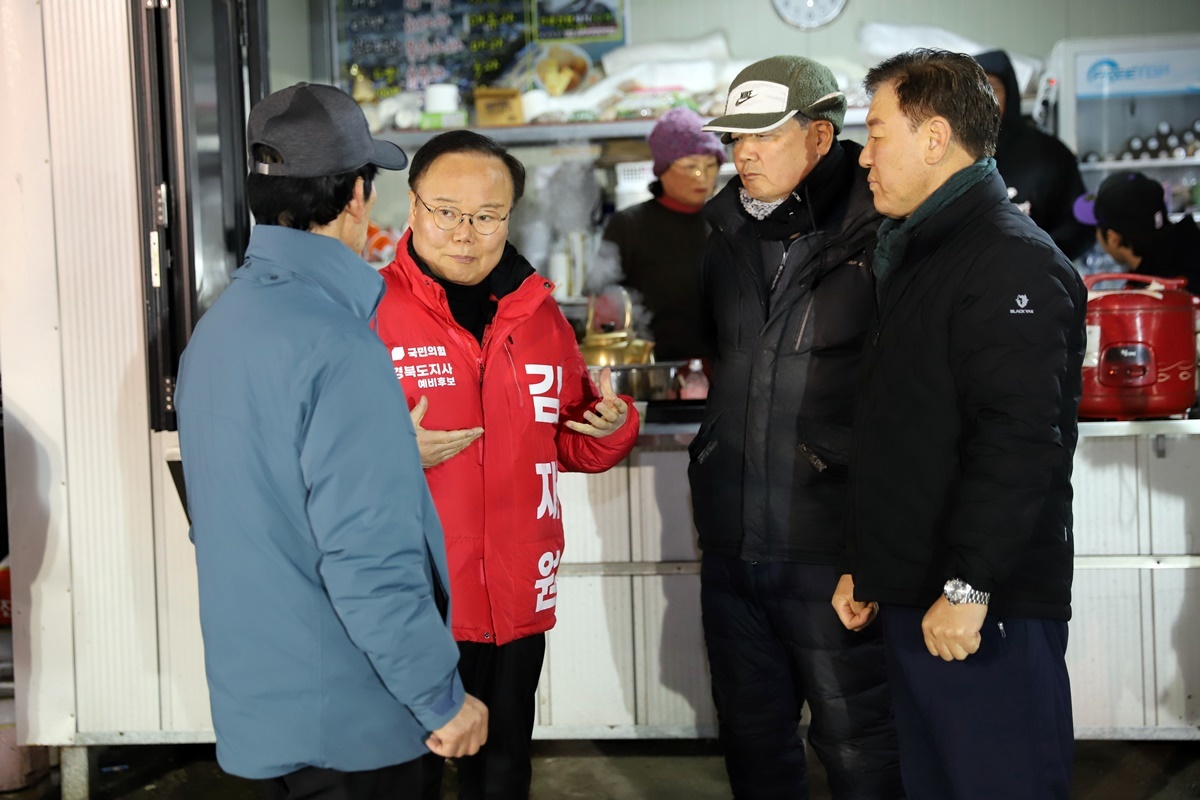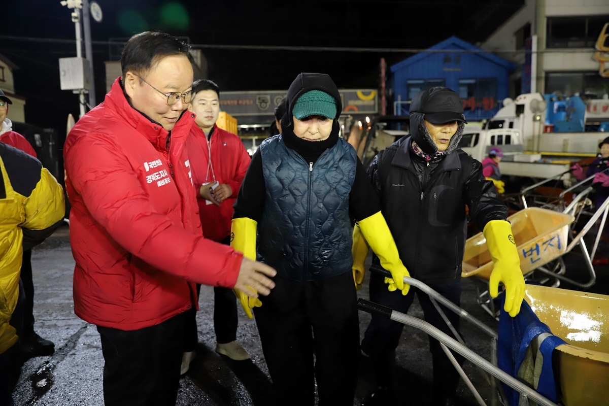 [영덕=뉴스핌] 남효선 기자 = 김재원 경북도지사 예비후보가 설 연휴 둘째 날인 15일, 영덕군 강구항 강구수협 위판장과 산불 피해마을을 찾아 주민들의 목소리를 청취하는 등 민생 현안을 꼼꼼하게 챙겼다.