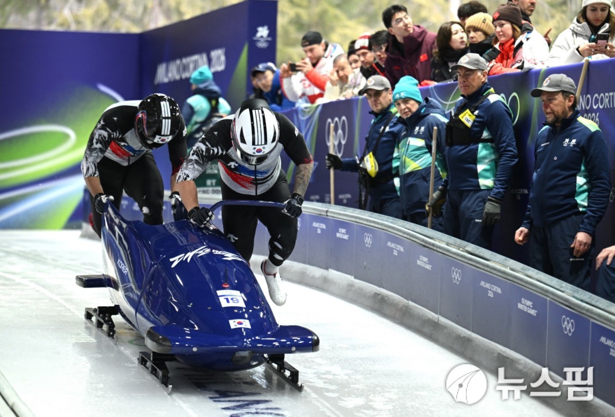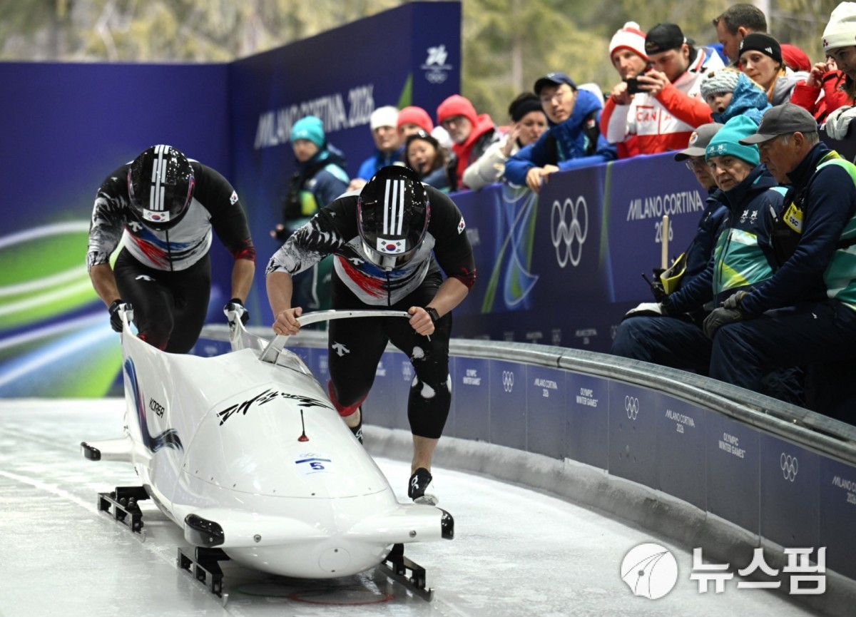 [코르티나담페초 로이터=뉴스핌] 박상욱 기자= 파일럿 김진수, 브레이크맨 김형근이 16일(한국시간) 2026 밀라노·코르티나담페초 동계올림픽 봅슬레이 남자 2인승 1차 시기에서 힘차게 출발하고 있다. 2026.2.16 psoq1337@newspim.com