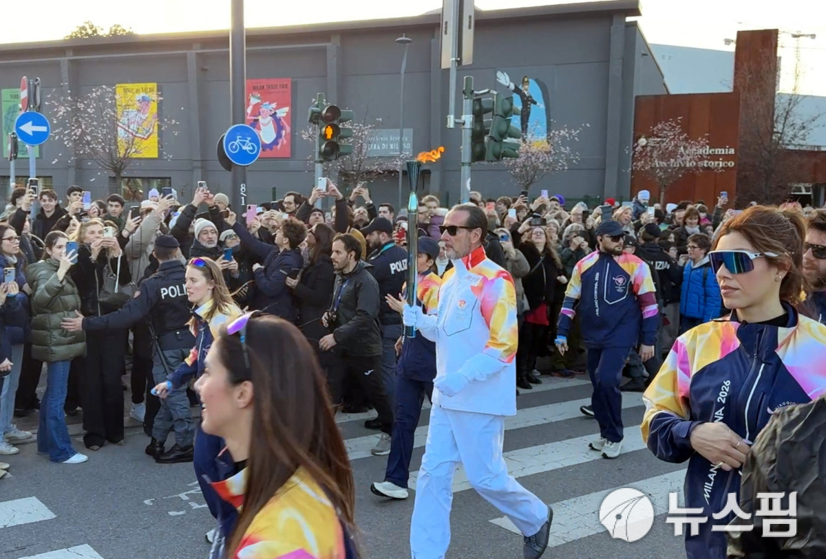 밀라노 시내 성화봉송 모습. 포근한 날씨에 시민들이 나와 휴대폰 카메라로 촬영하고 있다. [밀라노 로이터=뉴스핌]