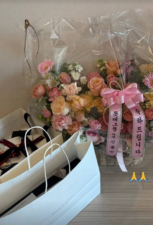 [서울=뉴스핌] 장환수 스포츠전문기자= 신동빈 롯데그룹 회장이 최가온의 자택으로 보낸 꽃바구니와 선물. [사진=최가온 SNS] 2026.02.17 zangpabo@newspim.com