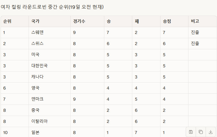 한국은 19일 오전 4경기가 끝난 현재 라운드로빈 5승 3패로 미국·캐나다와 공동 3위에 올라 있다. 스웨덴이 7승 2패, 스위스가 6승 2패로 남은 경기 결과에 관계없이 4강행을 확정했다. 한국-캐나다전과 함께 미국-스위스전과 영국(4승 4패)-이탈리아전이 남아 있어, 4강 최종 순위표는 아직 요동칠 여지가 남아 있다.