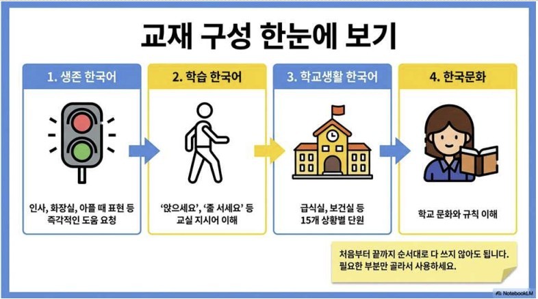 이번 익힘책은 "화장실이 급해요", "다시 한번 말해주세요"처럼 교실과 학교생활에서 가장 먼저 필요한 표현을 중심으로 구성해 언어 장벽으로 위축되기 쉬운 학생들의 수업 참여와 일상 의사소통 부담을 낮추는 데 초점을 맞췄다.