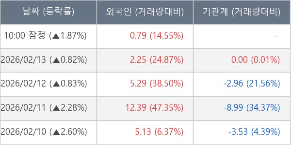 [서울=뉴스핌] 로보뉴스 = 19일 10시 15분 현재 한국알콜(017890)은 전일 대비 1.87% (현재가 12,530원) 상승했고, 외국인이 최근 10일 연속 순매수(누적 42.70만 주, 잠정) 행진을 하고 있다.