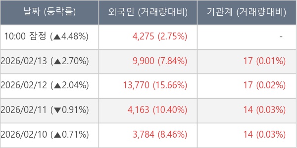 [서울=뉴스핌] 로보뉴스 = 19일 10시 15분 현재 덕우전자(263600)는 전일 대비 4.48% (현재가 5,360원) 상승했고, 외국인이 최근 6일 연속 순매수(누적 51,453주, 잠정) 행진을 하고 있다.
