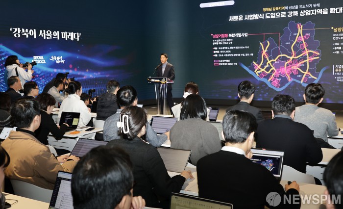 [서울=뉴스핌] 양윤모 기자 = 오세훈 서울시장이 19일 오전 서울시청 지하 1층 서울갤러리에서 개최된 강남북 균형발전을 위한 서울대개조 프로젝트 '다시 강북전성시대 2.0' 기자 설명회에 참석해 발표를 하고 있다.강북전성시대 2.0은 시비 10조원과 국고보조금·민간투자 6조원 등 16조을 투입해 강북을 중심으로 '서울의 새로운 경제 엔진'을 가동해 도시구조를 재편하는 사업이다. 2026.02.19 yym58@newspim.com