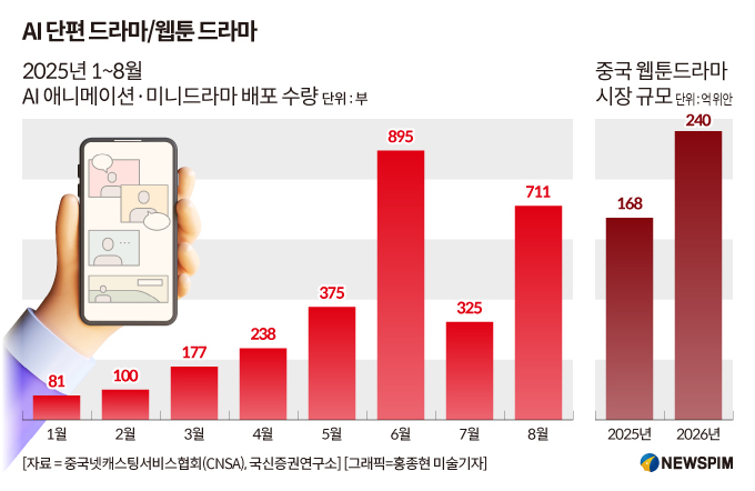 중국 디지털 컨텐츠 마케팅 서비스 제공업체 데이터아이(DataEye) 자료에 따르면, 중국 웹툰드라마 시장 규모는 2025년 168억 위안에서 2026년 240억 위안으로 늘어날 전망이다. 이는 국내 영화 시장의 절반에 가까운 규모다. 또한 해당 시장 내 AI 기술 침투율은 35%에서 70%로 급등할 것으로 예상된다.