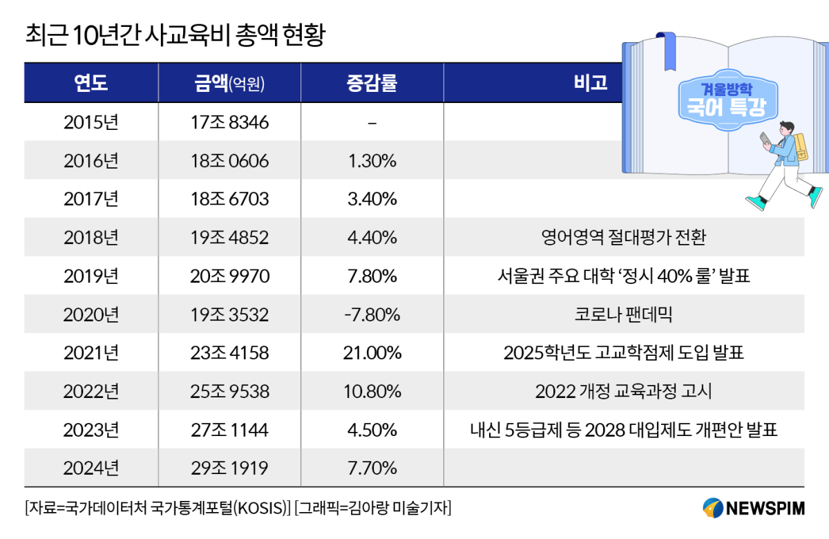 사교육비 29조, 10년 새 60%↑… '격차 해소' 정책과 엇박자