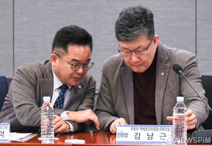 [서울=뉴스핌] 윤창빈 기자 = 민병덕 더불어민주당 을지로위원장, 김남근 쿠팡TF 택배분과위원장이 19일 서울 여의도 국회 의원회관에서 열린 쿠팡 개인정보유출’ 대책 간담회에서 대화를 하고 있다. 2026.02.19 pangbin@newspim.com