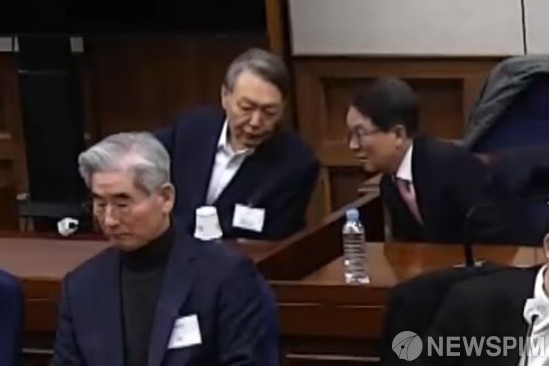 [서울=뉴스핌] 윤석열 전 대통령이 19일 오후 서울 서초구 서울중앙지방법원에서 열린 내란우두머리 혐의 1심 선고공판을 앞두고 변호인과 대화를 나누고 있다. [사진=서울중앙지법] 2026.02.19 photo@newspim.com