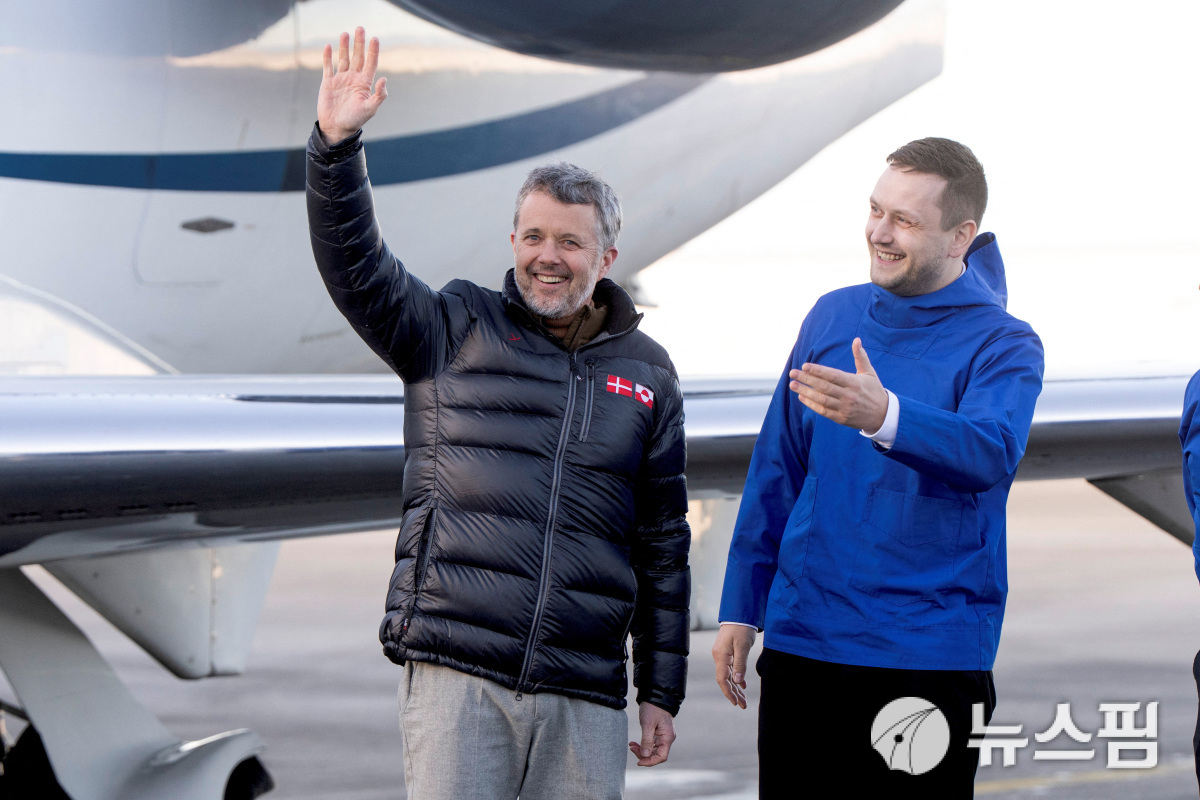 [누크 로이터=뉴스핌] 장일현 특파원 = 프레데리크 10세(왼쪽) 덴마크 국왕이 18일(현지 시간) 덴마크의 북극지역 자치령 그린란드의 수도 누크에 도착해 옌스 프레데리크 닐센 그린란드 총리의 영접을 받고 있다. 2026.02.19. ihjang67@newspim.com