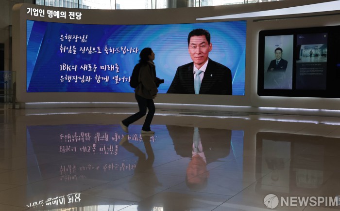 [서울=뉴스핌] 양윤모 기자= 장민영 제28대 IBK기업은행장 취임식이 개최된 20일 서울 중구 을지로 본점 1층 로비 기업인 명예의 전당 전광판에 장 행장의 취임을 축하하는 문구가 계시되고 있다. 장 은행장은 노조와 시간외수당 미지급 문제로 한달만에 취임식에 참석했다. 2026.02.20 yym58@newspim.com