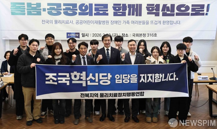 [서울=뉴스핌] 윤창빈 기자 = 조국 조국혁신당 대표 등 참석자들이 20일 서울 여의도 국회에서 열린 물리치료사, 공공어린이재활병원 장애인 가족 입당환영식에서 기념촬영을 하고 있다. 2026.02.20 pangbin@newspim.com