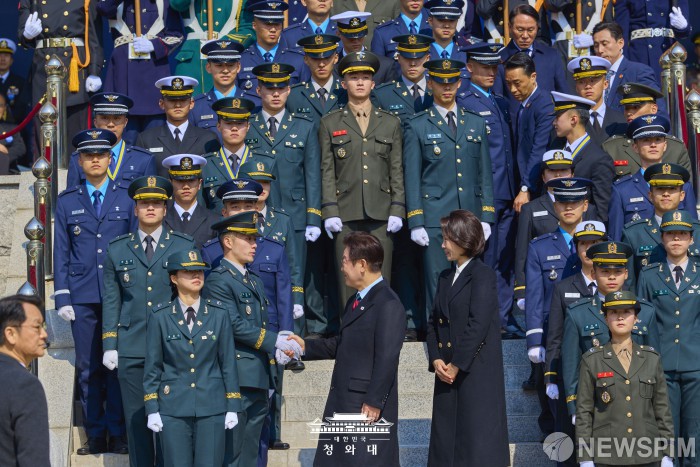 [서울=뉴스핌] 이재명 대통령이 지난 20일 충남 계룡대 대연병장에서 열린 2026년 3군 사관학교 통합임관식에서 신임 장교와 악수를 하고 있다. [사진=청와대] 2026.02.21 photo@newspim.com