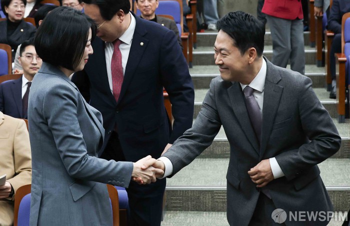 [서울=뉴스핌] 윤창빈 기자 = 장동혁 국민의힘 대표가 23일 오전 서울 여의도 국회에서 열린 의원총회에서 배현진 의원과 인사하고 있다. 2026.02.23 pangbin@newspim.com