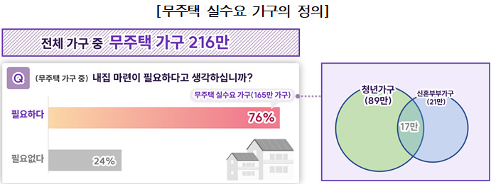 먼저 서울 시내 무주택 가구 216만 가구 중 76%인 165만 가구가 '내 집 마련이 필요하다' 느끼는 것으로 조사됐다. 이중 청년 실수요 가구는 89만, 신혼부부 실수요 가구는 21만 가구인 것으로 집계됐다.