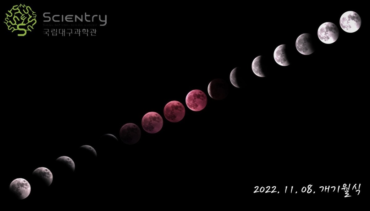 개기월식은 태양에 의한 지구의 그림자에 달이 가려지는 특별한 천문현상이다. 특히, 달이 지구 그림자에 가려지기 시작하면서 점점 작은 모양의 달로 바뀌다가, 완전히 가려지는 순간 지구 대기의 산란광에 의해 붉은 달로 관측된다.