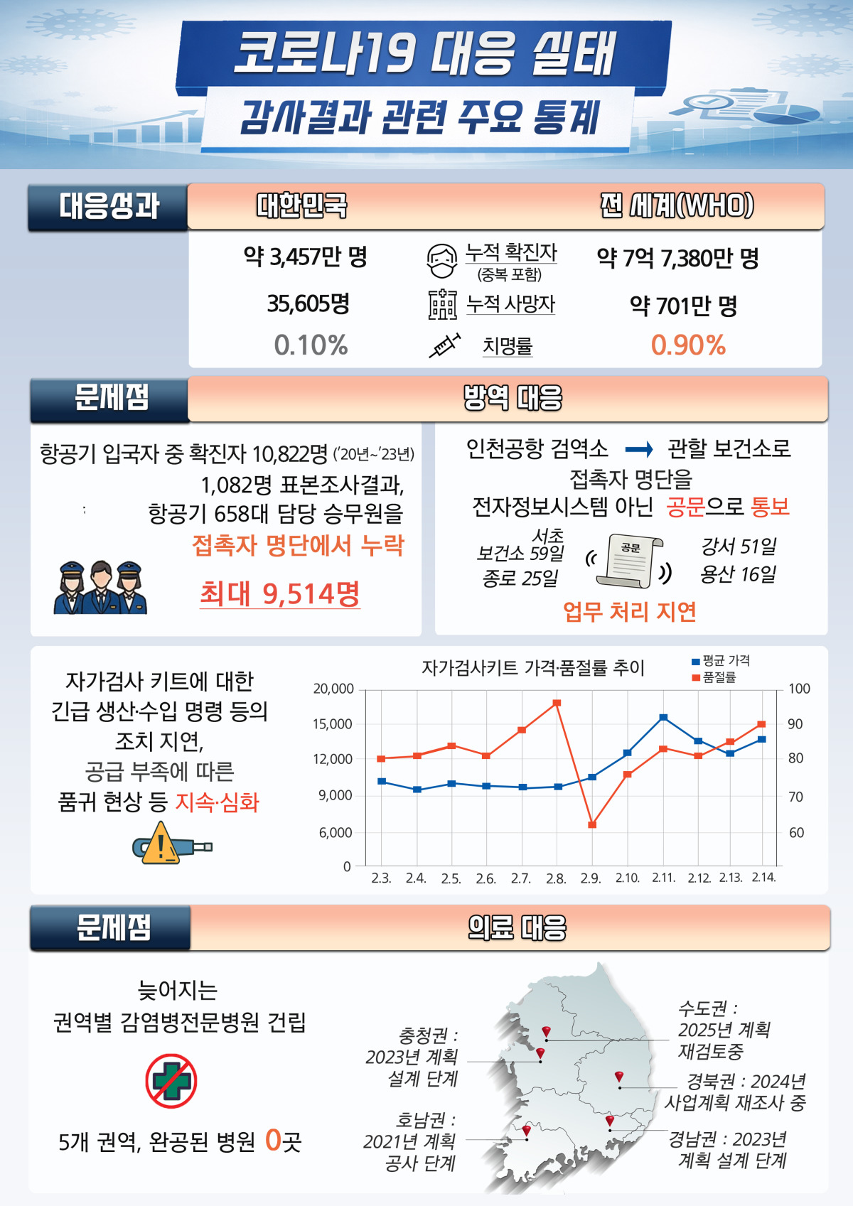 방역 인프라 측면에서도 허점이 드러났다. 인천공항검역소 확진자 1만822명 중 1082명의 접촉자 명단을 점검한 결과, 항공기 내 확진자 발생 때 담당구역 승무원이 접촉자 명단에서 단 1명도 분류되지 않아 최소 658명에서 최대 9514명이 누락된 것으로 추정됐다.