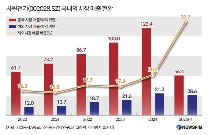 2025년 상반기 기준 사원전기 전체 매출 중 해외 매출 비중은 약 33.7%로, 2023년(17.3%)에 비해 크게 상승했다.