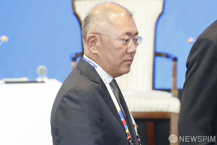 [서울=뉴스핌] 류기찬 기자 = 정의선 현대차그룹 회장이 23일 오후 서울 중구 롯데호텔 서울에서 열린 한-브라질 비즈니스 포럼에 참석하고 있다. 2026.02.23 ryuchan0925@newspim.com