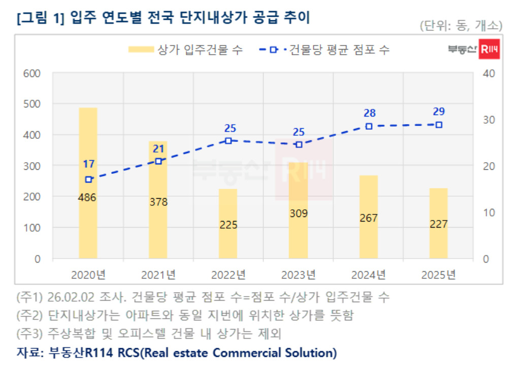 단지 내 상가 건물 1개동당 평균 점포 수는 오히려 증가하는 추세로 확인됐다. 2020년에는 단지 내 상가 1개동당 평균 17개소의 점포가 공급됐으나 ▲2023년 25개소 ▲2024년 28개소 ▲2025년에는 29개소로 평균 점포 수가 지속적으로 늘어났다.