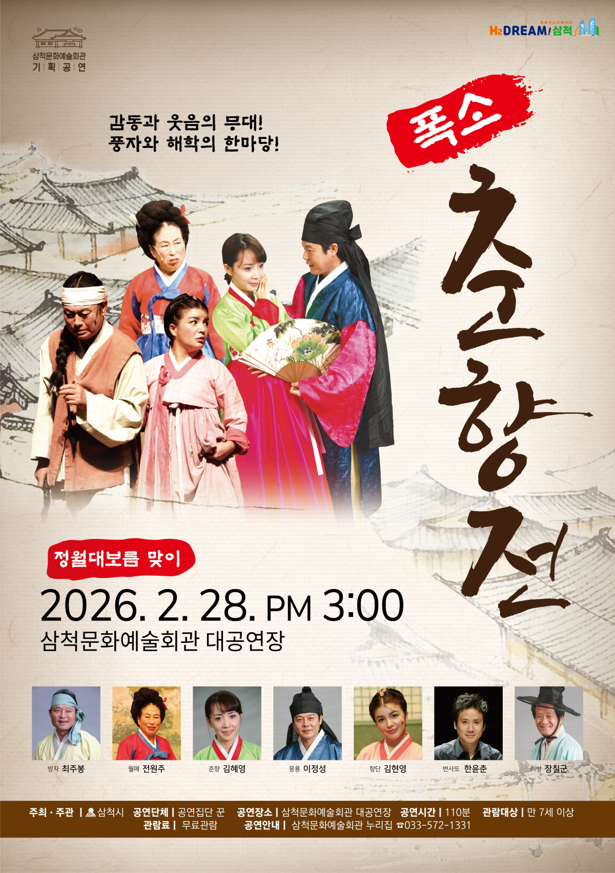 [삼척=뉴스핌] 이형섭 기자 = 강원 삼척시는 오는 28일 삼척문화예술회관 대공연장에서 악극 '폭소 춘향전'을 초청해 기획공연으로 선보인다고 24일 밝혔다.